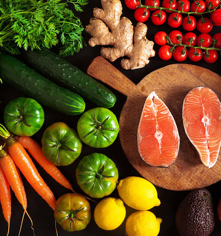 Verschiedene Gemüsesorten und Lachs